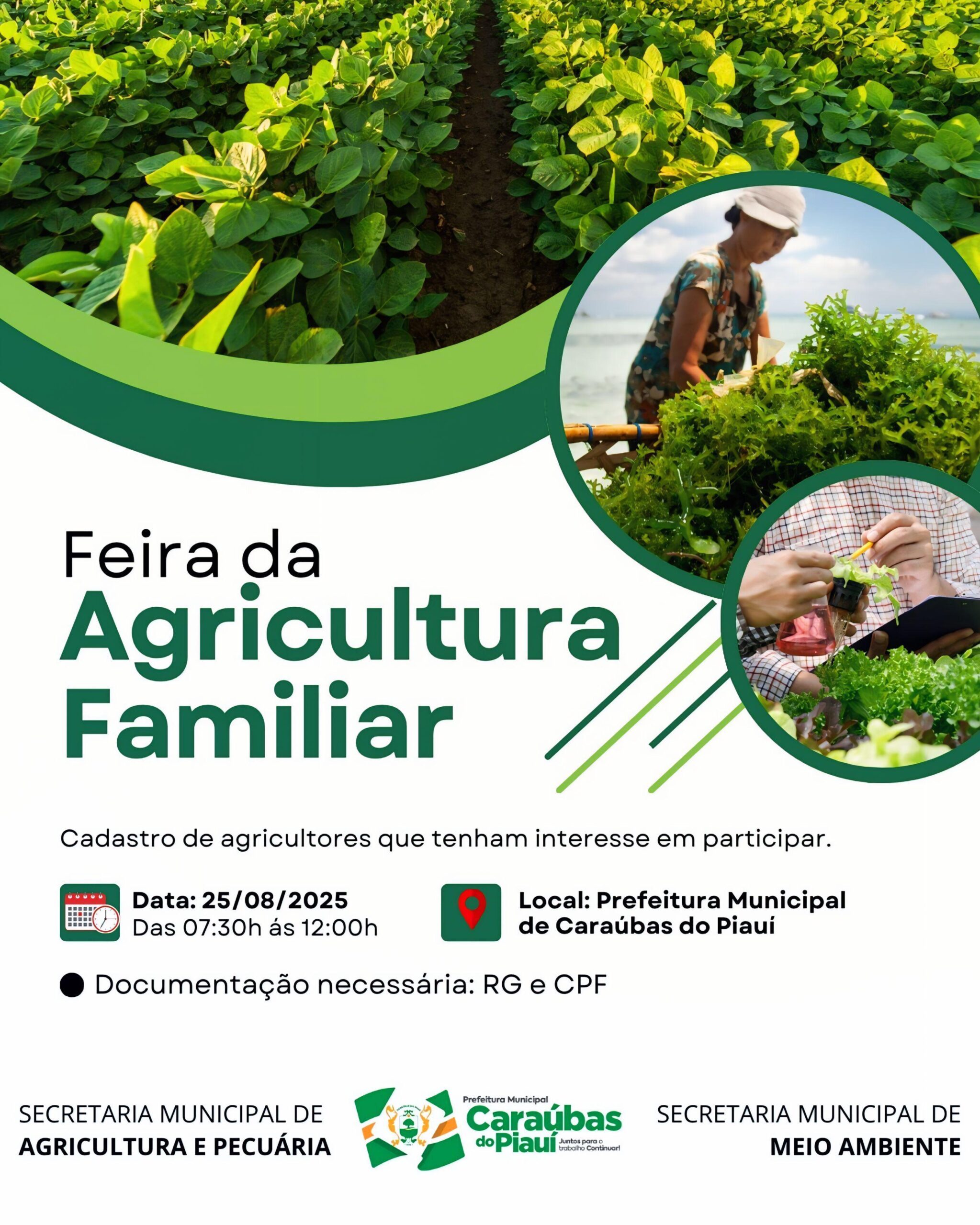 A Prefeitura Municipal de Caraúbas do Piauí, por meio da Secretaria de Agricultura e Pecuária e da Secretaria de Meio Ambiente, realizará no próximo dia 25 de agosto de 2025, o cadastro de agricultores interessados em participar da Feira da Agricultura Familiar.